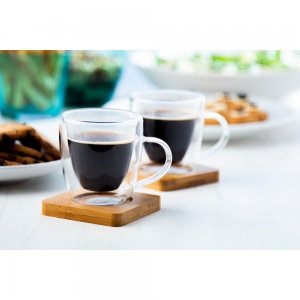 Doppelwandiges Espressotassen-Set aus Borosilikatglas mit 2 Tassen und Untertassen aus Bambus. Füllmenge: 90 ml. Verpackt in Präsentationsbox aus Kraftpapier.
