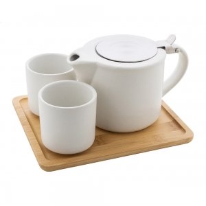 Hochwertiges Teeservice aus Keramik mit matter Oberfläche und Bambus-Serviertablett. Enthält eine Teekanne (500 ml) mit Edelstahldeckel und Teesieb sowie zwei Tassen (150 ml). Einzeln in Kraftpapierbox.