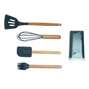 Artikel-Nr: INP56-03070345-teiliges Küchenset COOKING TOOLS: Silikon-Küchenhelfer mit Holzgriffen (Pfannenwender, Teigschaber, Pinsel und Schneebesen) im Halter