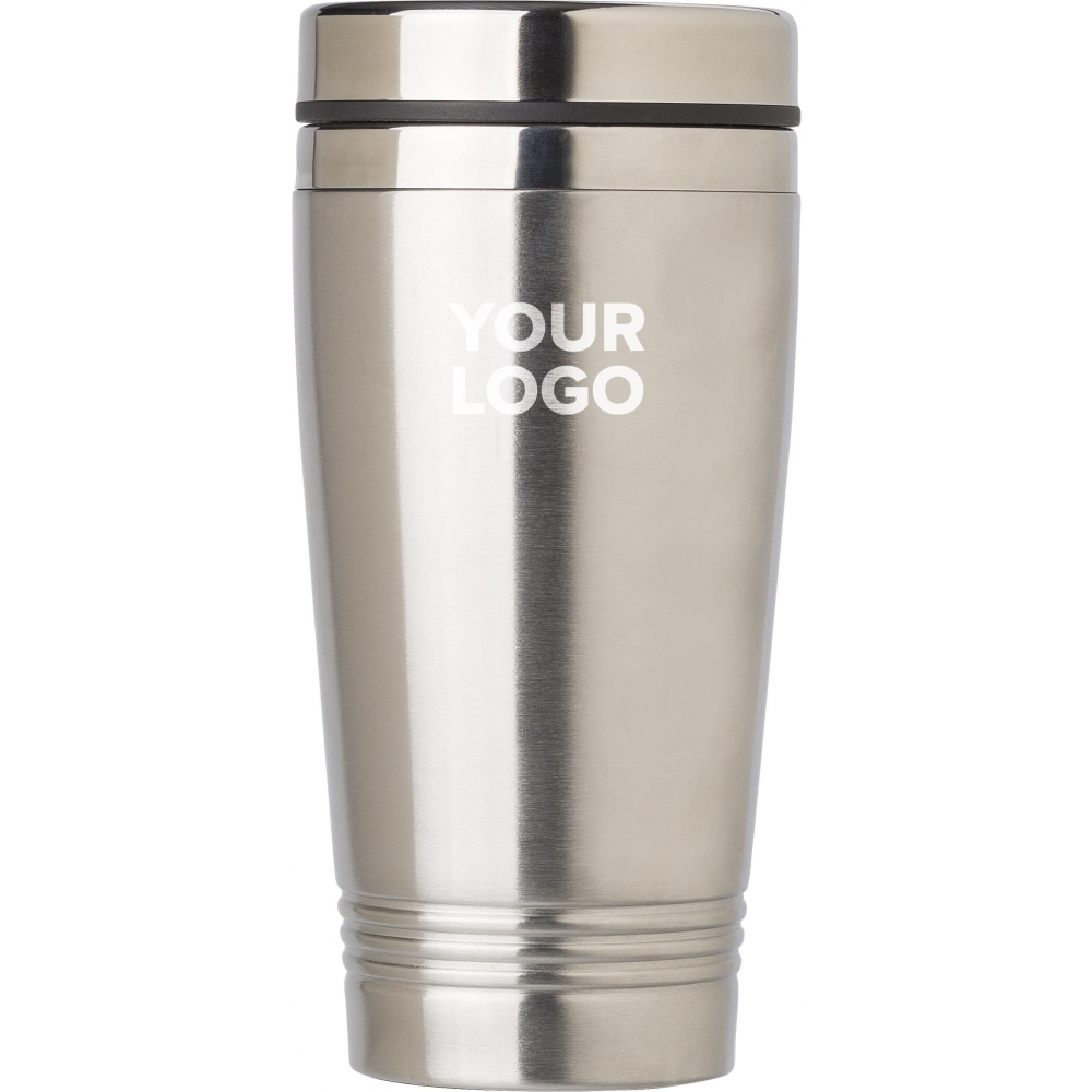 Edelstahl-Trinkbecher (450ml) mit Deckel. Geeignet für heiße Inhalte bis zu einer Temperatur von 70 Grad. Der Deckel hat eine Schiebeöffnung zum trinken. Anti-Rutsch-Boden und ist einzeln verpackt in einer braunen Kartonage.
