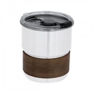 Becher aus rostfreiem Stahl und edlem Holz. Mit 250 ml Fassungsvermögen. Enthält elegantes Holzband. Enthält einen hermetischen transparenten Deckel mit Dosierer in der Abdeckung und einem Loch für Strohhalme, BPA-frei.