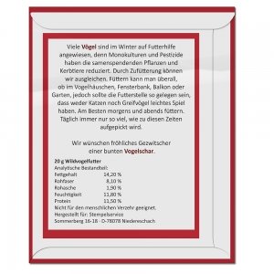 Artikel-Nr: NMT607-2Wer liebt sie nicht, unsere gefiederten Freunde? Locken Sie mit dem Futterhaus BIRDIE die Vögel vors Fenster oder in den Garten! Volumen des Futterbehälters: 1.300 ml Material: ABS (teilweise recycelt), PP, Polyester Maße: Ø 285 mm, H170 mm Gewicht ohne Verpackung: 280 g Plastikfreie Einzelverpackung, VE: 5 St. Vom Verkaufspreis spenden wir € 0,50 an das Streuobstwiesenprojekt OBSTGUT LEISBERG, bei dem viele Freiwillige die überkommene Kulturlandschaft und Biodiversität pflegen. Werbeanbringung: Auf der Außenseite des Daches 40 x 15 mm (D3); Dieses Produkt unterstützt aktiv den Ausgleich der entstehenden CO2-Emissionen durch zertifizierte Klimaschutzprojekte.