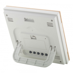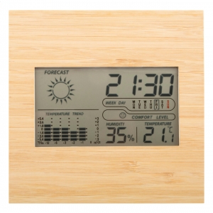 Digitale Wetterstation / Uhr mit Bambusfront. Funktionen: Wecker, Kalender, Thermometer, Feuchtigkeitsanzeige und Temperaturtrendspeicher. Batteriebetrieben, exkl. Batterien (2 x AAA).