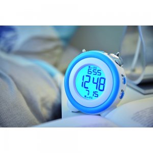 Wecker MODERN RETRO: mit digitaler Zeit- und Datumsanzeige, zwei Weckzeiten sowie Weckintervalle für verschiedene Wochentage einstellbar, Snooze-Funktion im 5-Minuten-Takt, Alarm mit Retro-Läutwerk, blaue Hintergrundbeleuchtung, blaue Bedientasten an den Seiten, batteriebetrieben (3x AAA Batterie nicht enthalten)