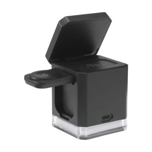 3-in-1-Ladestation/Schnellladegerät mit einem Gehäuse aus 100% RCS-zertifiziertem recyceltem ABS. Das Ladegerät hat eine attraktive Würfelform mit beweglichen Teilen zum gleichzeitigen Laden Ihres iPhones (ab Version 12), Ihrer Kopfhörer und Ihrer Apple Watch. Es verfügt über eine Magnetfunktion (Magsafe) zum kabellosen Laden Ihres iPhones. Die integrierten Magnete im Ladegerät sind perfekt ausgerichtet und sorgen immer dafür, dass die Smartwatch in der richtigen Position geladen wird. Dieses Ladegerät wird mit einem zusätzlichen magnetischen Metallring geliefert, der das Laden von nicht magnetischen, kabellos wiederaufladbaren Smartphones unterstützt. Eingang: DC9V 3A. Drahtlose Ausgangsleistung Smartphone: 5 W/7,5 W/10 W/15 W, iWatch: 3 W, TWS-Kopfhörer: 5 W. Kann auch als Wecker in Kombination mit Ihrer Smartwatch verwendet werden. Das Ladegerät verfügt über eine integrierte LED-Beleuchtung und eine rutschfeste Unterseite. Enthält ein rTPE-USB-C/USB-C-Ladekabel (passende Farbe) und eine Gebrauchsanweisung.
