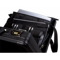 Aktenkoffer aus weicher Mikrofaser mit rückseitiger Reißverschluss- Tasche, die auch zum Einhängen in einen Trolleygriff genutzt werden kann. Verstärkte Tragegriffe und Schultertragegurte. Gepolsterte Innenseite für Laptops bis 15'.