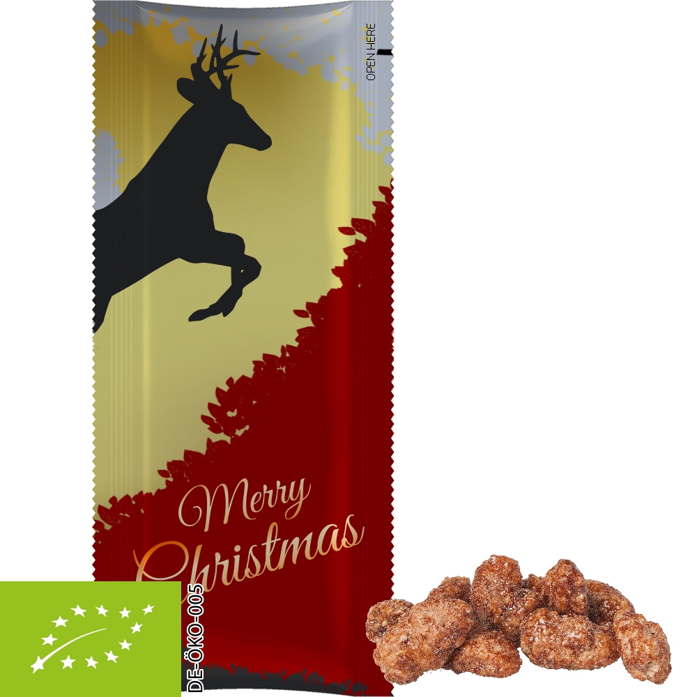 Snack Stick aus weißer Folie oder transparenter Folie. Werbeanbringung als Direktdruck in 4c individuell bedruckbar. Zutaten Bio Feuergebrannte Mandeln: Mandeln*, Rohrohrzucker*, Zimt*, Kakao*; *aus kontrolliert biologischem Anbau.
