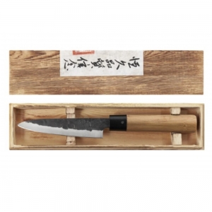 Küchenmesser in bester japanischer Handwerkstradition, handgearbeitet aus feuergehärtetem Stahl für Gourmetköche. Handgeschmiedeter 18/10 Stahl, rostfrei, Griff aus Holz - perfekt für Lasergravuren, Klinge wetzbar, VPE 24. Feuergehärtete Holzdesignbox, Designschuber