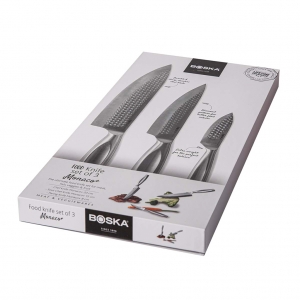Mit den Küchenmessern Kitchen Knives Copenhagen der Marke BOSKA – einem von B Corporation zertifizierten Unternehmen – schneiden Sie jede Art von Lebensmitteln mühelos. Ein Set aus drei scharfen und unverzichtbaren Messern mit einzigartigem Design, die vollständig aus Edelstahl gefertigt sind. Leicht, spülmaschinenfest und mit einem ergonomischen Griff, der auf verschiedene Schneidetechniken und Lebensmittel zugeschnitten ist. Für ein Leben lang!