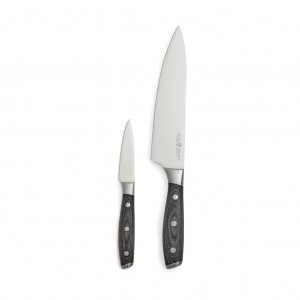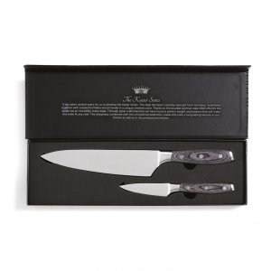 Set van koksmen en schilmes. Exklusives Kochmesser aus der Kaiser Serie. Die Entwicklung dieser Messerserie hat mehrere Jahre gedauert. Der X50CrMoV15 Stahl ist sorgfältig aus Deutschland ausgewählt, der Griff ist aus Pakkaholz. Der Griff ist leicht zu greifen, was zusammen mit seinem ausgewogenen Körper das Arbeiten komfortabler und einfacher macht. Die guten Eigenschaften des deutschen Stahls führen dazu, dass die Klingen schmutzabweisend sind und keinen höheren Wartungsaufwand als Schleifen erfordern. Seine Schärfe hält lange an und wenn Sie es schleifen müssen, ist es eine einfache Aufgabe.