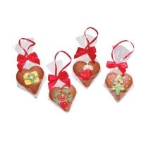 Mit Zuckerguss weihnachtlich von Hand verziert Größe: 8 cm Gewicht: ca. 20 g Haltbarkeit: 6 Monate Verpackung: Einzeln im Glanzbeutel mit roter Satinschleife auf Aufhängeband aufgebunden.