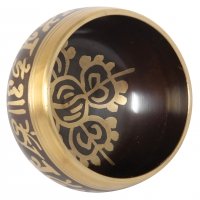 Aus Messing mit Holzklöppel. Reine Handarbeit - daher kann die Klangschale in Größe, Gewicht, Design variieren. Mit dem Holzklöppel bringt man die sehr schön und anhaltend tönende Schale zum Klingen.