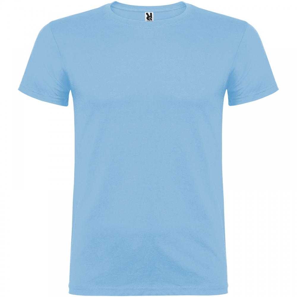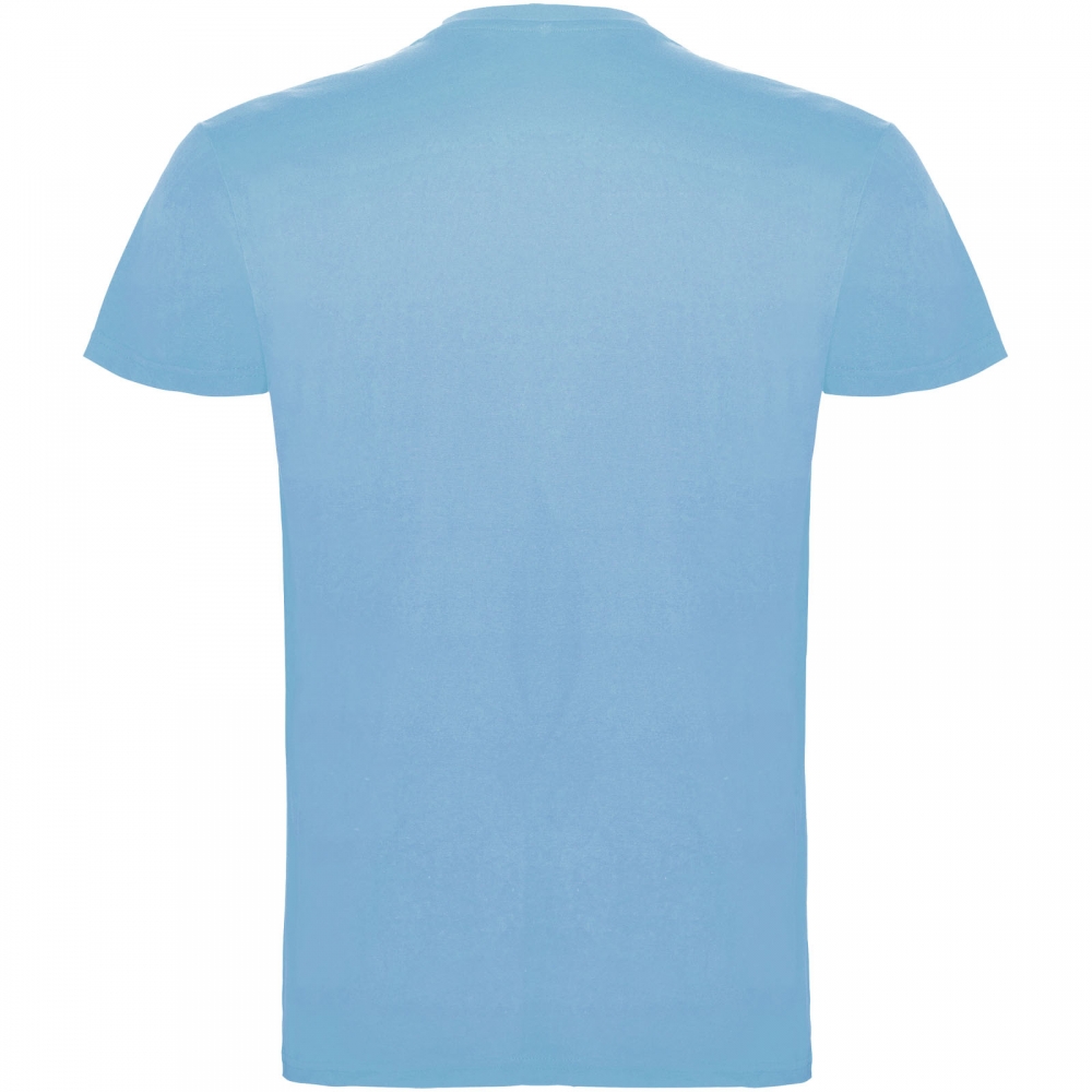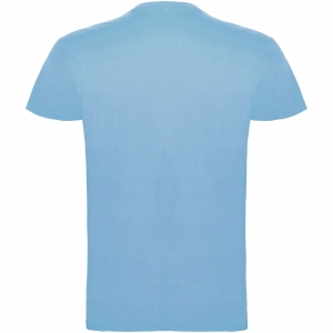 Kurzärmeliges T-Shirt mit doppellagigem Rundhalsausschnitt aus Elasthan, hergestellt aus schlauchförmigem Material für Erwachsene. Verstärkte und verdeckte Nähte am Kragen. Herausnehmbares Etikett. Das Modell ist 190 cm groß und trägt Größe L.