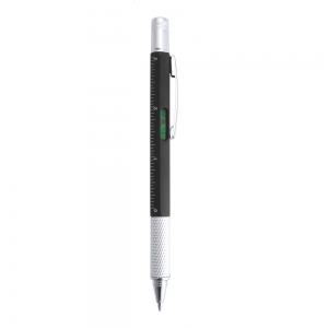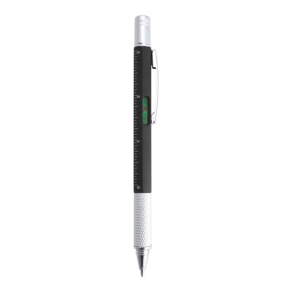 Kunststoffkugelschreiber, blauschreibend, mit Metallclip. Funktionen: Schlitz- und Kreuzschraubendreher, Wasserwaage, und 7cm- / 3 Zoll-Linealen.