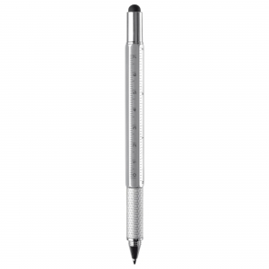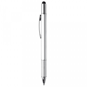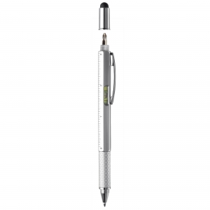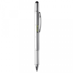 Multifunktionaler Kugelschreiber mit Touchspitze, inklusive Wasserwaage, Schraubendreher und Lineal. Blauschreibend.