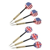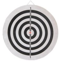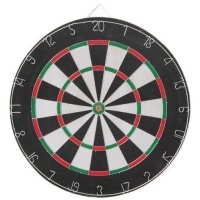 Das preisgünstige Dartboard hat einen Durchmesser von 36 cm und Feldabgrenzungen aus Metalldraht. Auf der Rückseite gibt es eine Zielscheibe zum Üben. Je 3 rote und grüne Wurfpfeile machen das Dartspiel komplett. Achtung! Kein Spielzeug!