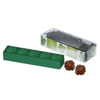 Inhalt: Klarsicht-Stülpbox mit Pralinenform aus Silikon, für die Herstellung von Glücks-Kleeblättern aus Schokolade, sowie einem Einleger mit Rezept.