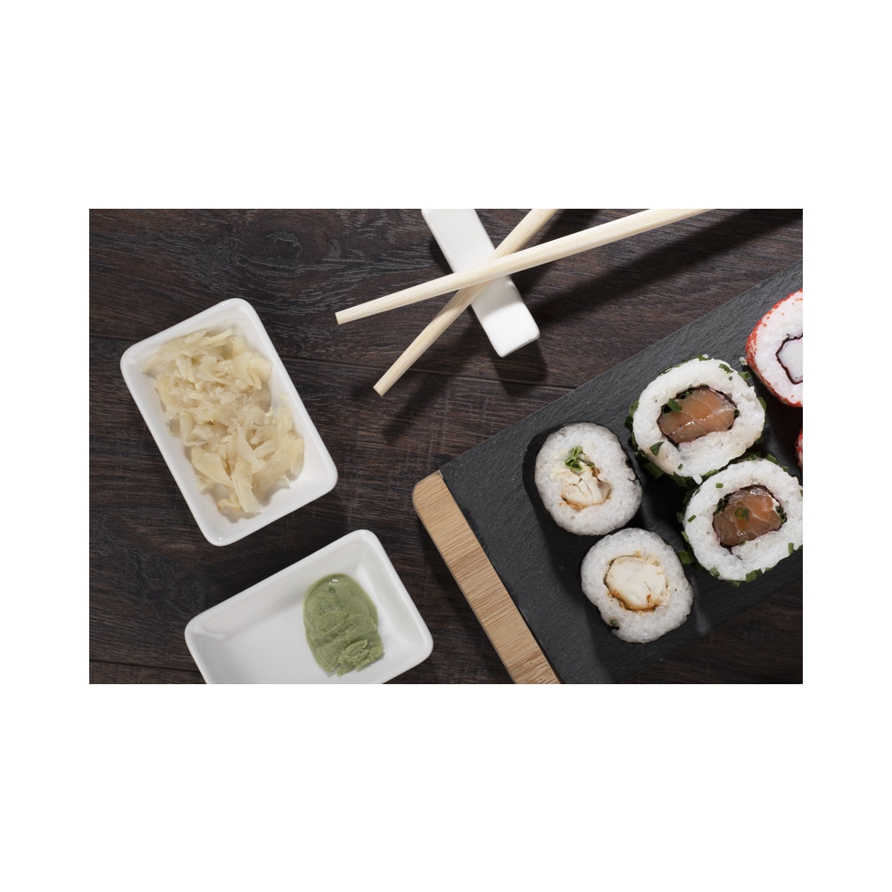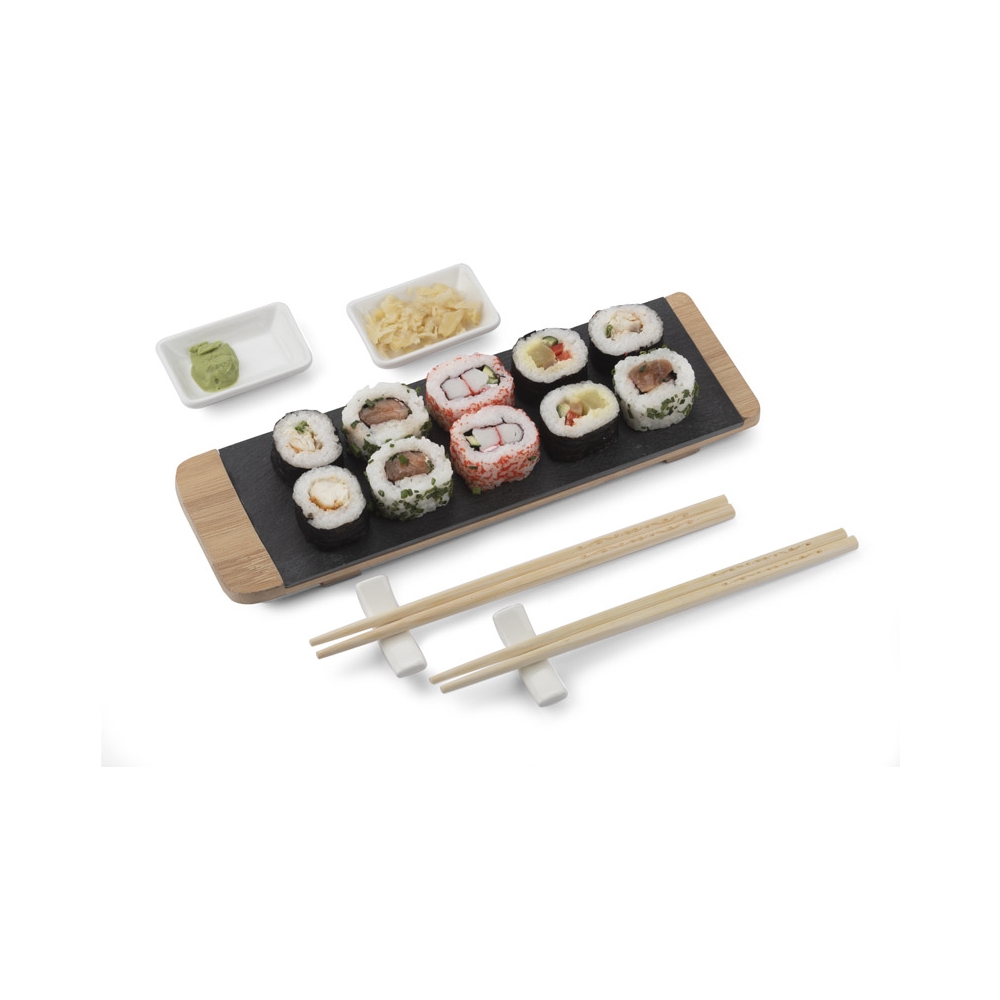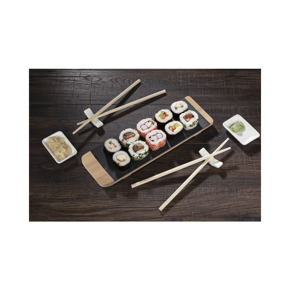 Artikel-Nr: ARD16528Ein Sushi-Set ist eine tolle Geschenkidee. Das Set enthält eine Bambusmatte mit Steinbrett, Bambus-Essstäbchen mit Ständern und Saucen-Schalen. Set für zwei Personen. Es wird jedem Sushi-Liebhaber gefallen.