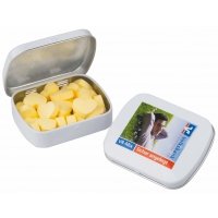 Artikel-Nr: 8791059Weiße Metalldose mit Scharnierdeckel, eingeschweißt in transparenter Folie, Volumenabfüllung: max. 25 g, Füllung A: Mint-Pastillen, Schoko-Konfetti bunt, Mint-Sternchen, Traubenzucker-Pastillen, Traubenzucker Herzen Zitrone o. Orange, Traubenzucker Sanddornfrucht oder Salmiak-Splitter, Druckart: Tampondruck