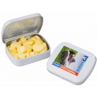 Artikel-Nr: 8791062Weiße Metalldose mit Scharnierdeckel, eingeschweißt in transparenter Folie, Volumenabfüllung: max. 25 g, Füllung A: Mint-Pastillen, Schoko-Konfetti bunt, Mint-Sternchen, Traubenzucker-Pastillen, Traubenzucker Herzen Zitrone o. Orange, Traubenzucker Sanddornfrucht oder Salmiak-Splitter, Druckart: Tampondruck