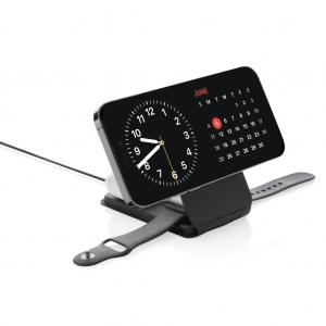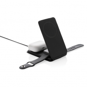 Artikel-Nr: XND308541Luxuriöses und faltbares kabelloses 3-in-1-Ladegerät aus RCS-zertifiziert recyceltem PU. Gesamter recycelter Inhalt: 5%, bezogen auf das Gesamtgewicht des Artikels. Die RCS-Zertifizierung gewährleistet eine vollständig zertifizierte Lieferkette für die recycelten Materialien. Das kabellose Ladegerät ist auf der Vorderseite mit einem magnetischen kabellosen 15W-Ladegerät ausgestattet. Auf der Rückseite befindet sich ein zusätzliches kabelloses 5W-Ladegerät, das für Ohrhörer oder andere kleine kabellos aufladbare Geräte geeignet ist, sowie ein kabelloses 2,5-W-Ladegerät für Ihre Apple Watch. Inklusive 120cm langem, RCS-zertifiziert recyceltem TPE-Kabel. Verpackt in FSC®-Mix-Kraftverpackung. Artikel und Zubehör 100% PVC-frei. Input: 9V/3A für optimale Nutzung. Output: Vorderseite: 9V/1.1A; 9V/1.67 A/(15W), Kopfhörer: 5V/1A (5W), Uhr: 5V/0,5A.