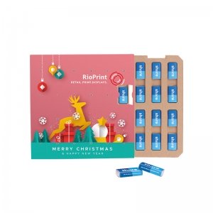 Artikel-Nr: PUC1265.00007Adventskalender in Vollkartonhülle mit Papierblister, Hülle individuell bedruckt. Mit ausklappbarem Tischaufsteller und Aufhänger im Rücken integriert. Inhalt: 24 share Schokotäfelchen mit Banderole aus weißem Papier eingewickelt in Pergaminpapier (kann über die Papiertonne entsorgt werden), 72 g. Saisonartikel - solange der Vorrat reicht!