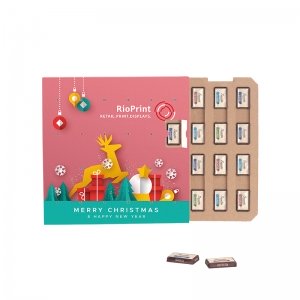 Artikel-Nr: PUC1265.00009Adventskalender in Vollkartonhülle mit Papierblister, Hülle individuell bedruckt. Mit ausklappbarem Tischaufsteller und Aufhänger im Rücken integriert. Inhalt: 24 Sarotti Schokoladentäfelchen in 4 verschiedenen Sorten (Vollmilch, Zartbitter, Haselnuss, Gianduja) bunt gemischt, 100g Saisonartikel - solange der Vorrat reicht!