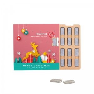 Artikel-Nr: PUC1265.00002Adventskalender in Vollkartonhülle mit Papierblister, Hülle individuell bedruckt. Mit ausklappbarem Tischaufsteller und Aufhänger im Rücken integriert. Inhalt: 24 Alpenmilch-Schokotäfelchen, eingewickelt in Pergaminpapier (kann über die Papiertonne entsorgt werden) Saisonartikel - solange der Vorrat reicht!