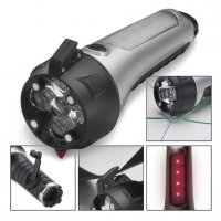 Artikel-Nr: 34251048Rettung in der Not: Die fünf energiesparenden LEDs der Taschenlampe lassen sich je nach Helligkeitsbedarf einzeln schalten. Das seitliche, mit vier LEDs ausgestattete rote Signallicht sorgt blinkend für Aufmerksamkeit. Gurtschneider und Sicherheitshammer befreien Sie im Notfall. Der Dynamobetrieb sichert Strom auch ohne Batterien und vier Magnete versprechen griffbereite Befestigung.