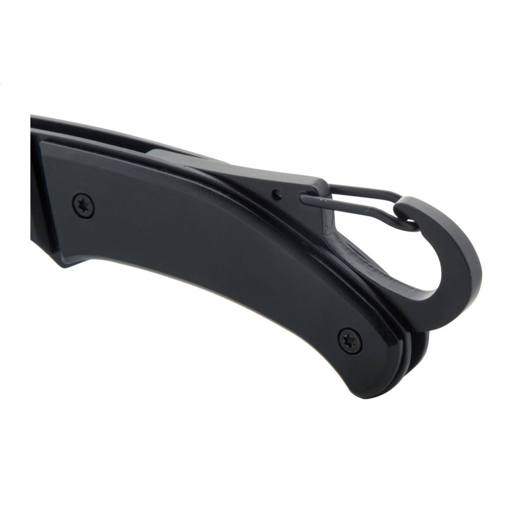 Artikel-Nr: AND808105-10Komplett schwarzes Edelstahl-Taschenmesser mit Aluminium-Griffen, Karabiner und Sicherheitsverschluss.