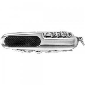 Artikel-Nr: GIV8715032Taschenmesser aus rostfreiem Stahl, 11-tlg., bestehend aus Flaschenöffner, Korkenzieher, Kreuzschraubendreher, zwei Sägen, Schere, drei Messern und Drahtbinder.