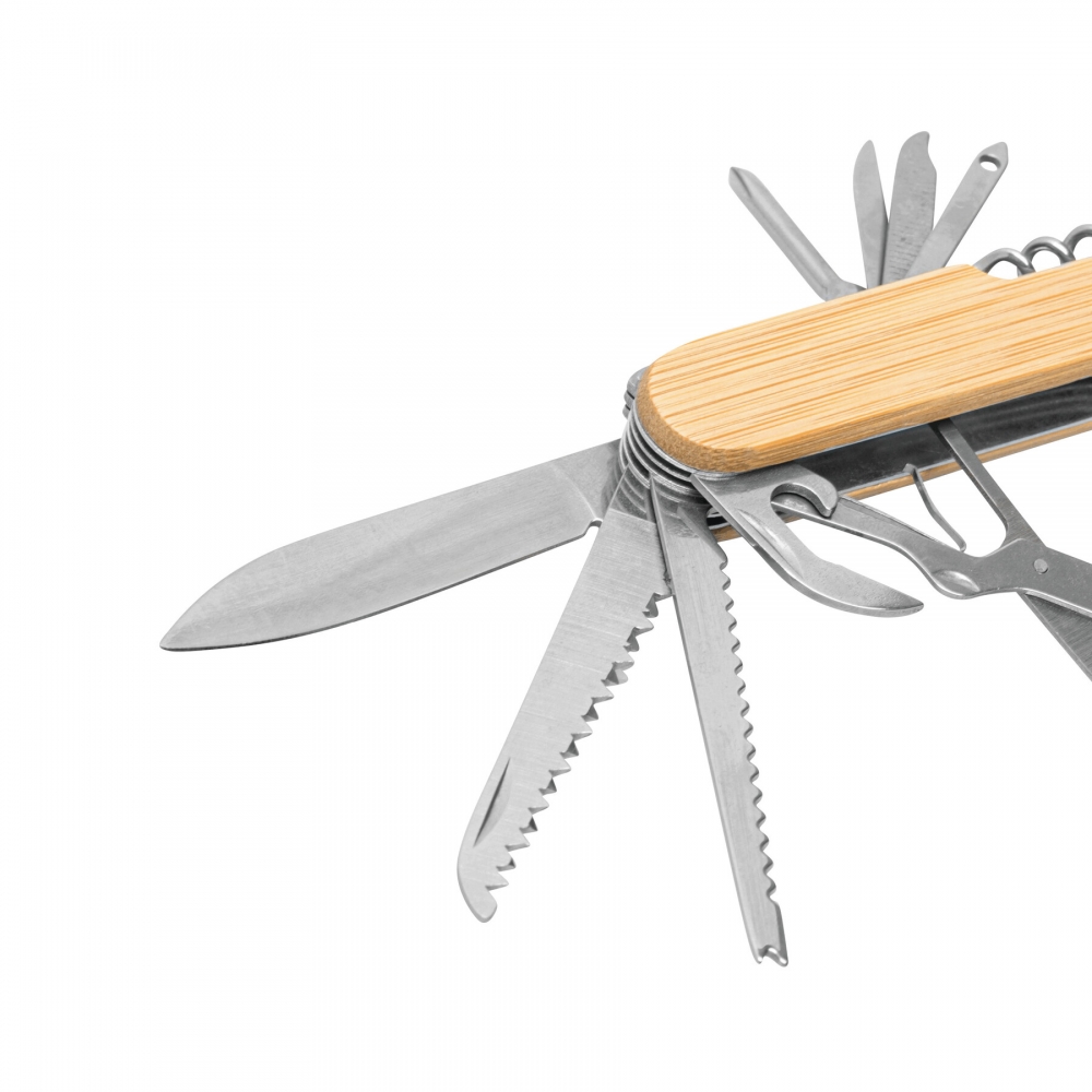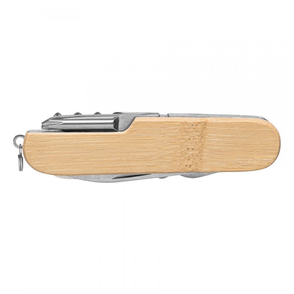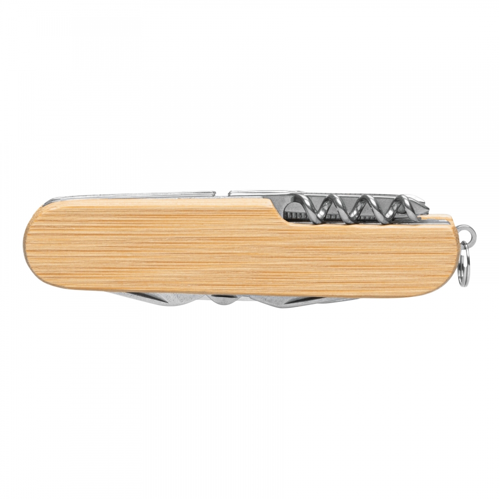 Artikel-Nr: INP56-0301172Taschenmesser BAMBOO HELPER, 11-teilig: bestehend aus Schere, große Säge, kleine Säge, Messer, Dosenöffner, Flaschenöffner, Korkenzieher, Ahle, Feile, Lochstecher und Kreuzschraubendreher, inkl. Schlüsselring, aus Edelstahl mit Bambus-Griff, in Box