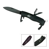 Artikel-Nr: 57383190SW-SWElegantes Taschenmesser für viele Gelegenheiten. Alle Teile sind aus schwarz beschichtetem rostfreiem Edelstahl 420 gefertigt: Messer (Klingenlänge 8 cm), Dosenöffner, Kronkorken-Heber, Korkenzieher und Ahle. Die gummierte Oberfläche des Griffes unterstreicht die hochwertige Verarbeitung und Qualität. Nylon-Gürteltasche inkl.