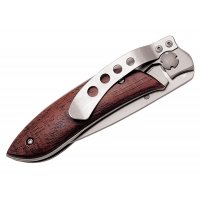 Edelstahlklinge mit Sicherheitssperre. Einhändig auf- und zuklappbar. Griff aus Rosenholz und Edelstahl mit Gürtelclip.