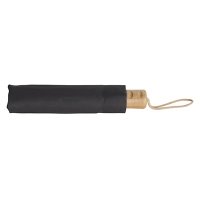 Kleiner Taschenschirm mit Holzgriff, Metallspeichen und Handschlaufe.