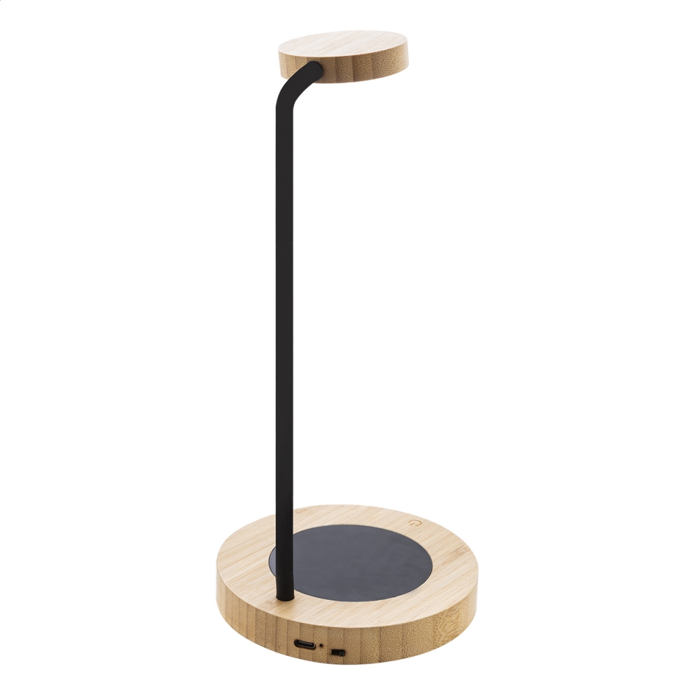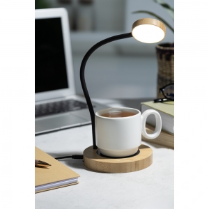Artikel-Nr: AND864107Multifunktionale Schreibtischlampe aus Bambus mit integriertem Tassenwärmer. Mit warmem, natürlichem und kühlem Lichtmodus. Inklusive USB-Ladekabel.