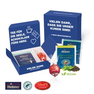 Artikel-Nr: CDL91745Ein Moment zum Durchatmen. Zwei aromatische Tees von Meßmer und eine zartschmelzende Lindor Praline von Lindt vereinen sich zu einem Moment purer Entspannung. Die hochwertige Box lässt sich individuell mit Ihrem Logo oder Design bedrucken und wird so zum perfekten Präsent für Kunden und Mitarbeiter. Ein genussvolles Dankeschön mit Stil.