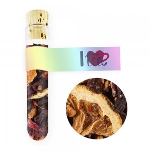 Zutaten: Apfelstücke, Hibiskusblüten, Hagebuttenschalen, Orangenschalen, Orangenspalten mit Schale, natürliche Orangenaromen, Färberdistelblüten