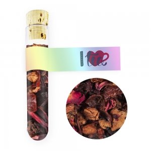 Zutaten: Apfelstücke, Hibiskusblüten, Hagebuttenschalen, Sauerkirschen, Aromen, Rosenblütenblätter