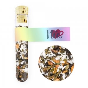 Zutaten: Kokosnussraspel, Pu Erh Tee - Tee mit spezieller Fermentation (32 %), Apfel, natürliche Aromen, süße Brombeerblätter