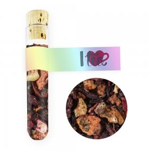 Zutaten: Apfelstücke, Hibiskusblüten, Holunderbeeren, süße Brombeerblätter, Hagebuttenschalen, Aromen, Erdbeerscheiben, Brombeeren, Himbeeren, Heidelbeeren