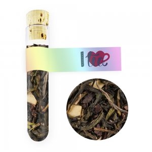 Zutaten: Weißer Tee (71 %), Kakaoschalen, weiße Schokoladenplättchen (Zucker, Kakaobutter, Vollmilchpulver, Emulgator: Sonnenblumenlecithin) (10 %), Aromen