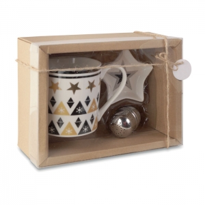 Artikel-Nr: OCBCX1443-99Set bestehend aus einem Teebecher aus Keramik, Tee-Ei und kleinem Untersetzer. Lieferung in einer Schachtel mit transparentem Deckel und Geschenkband.