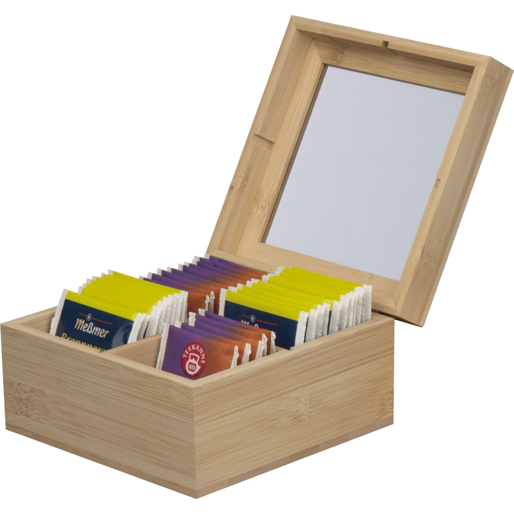 Artikel-Nr: MCM8229613Aufbewahrungsbox aus Bambus für bis zu 40 Teebeutel mit Glasdeckel und unterteilten Fächern. Ihre Werbung wird per Lasergravur außen an der Box angebracht.