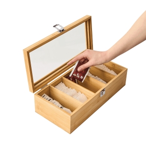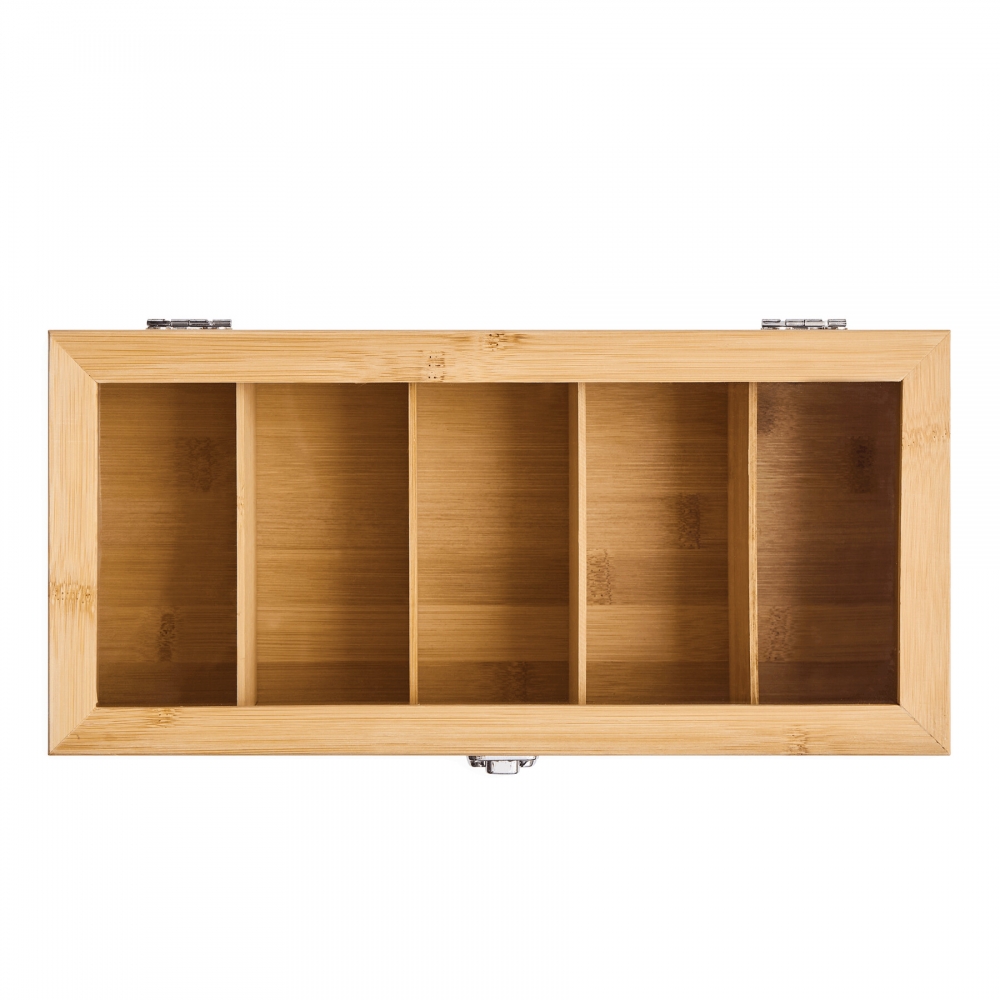 Artikel-Nr: INP56-0304405Teebox TEA LOUNGE: aus Bambus, mit 5 getrennten Fächern zum Befüllen mit Teebeuteln, mit Sichtfenster aus Glas im Deckel und Schnappverschluss, in Box