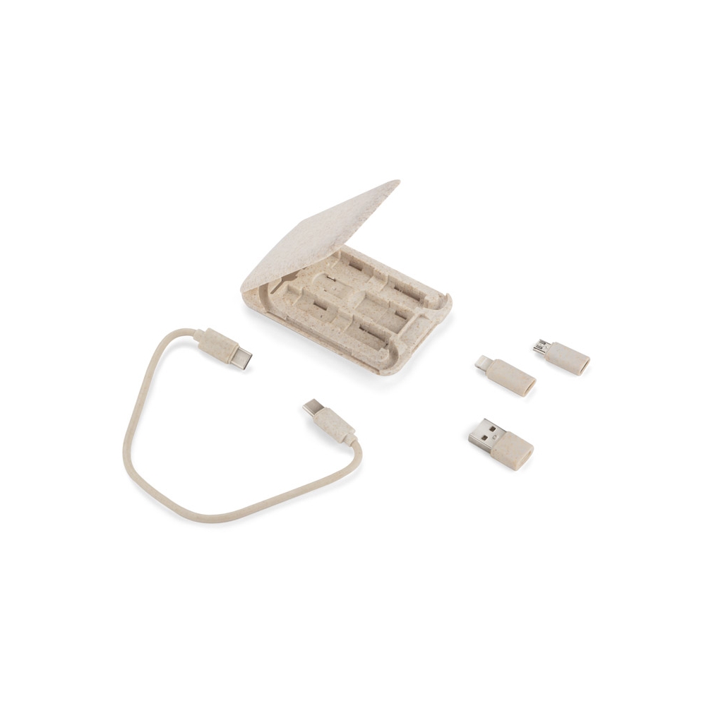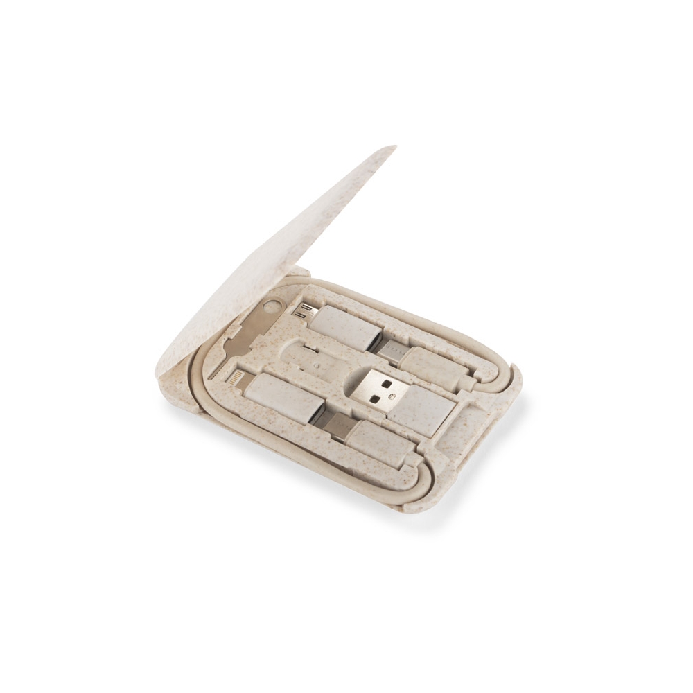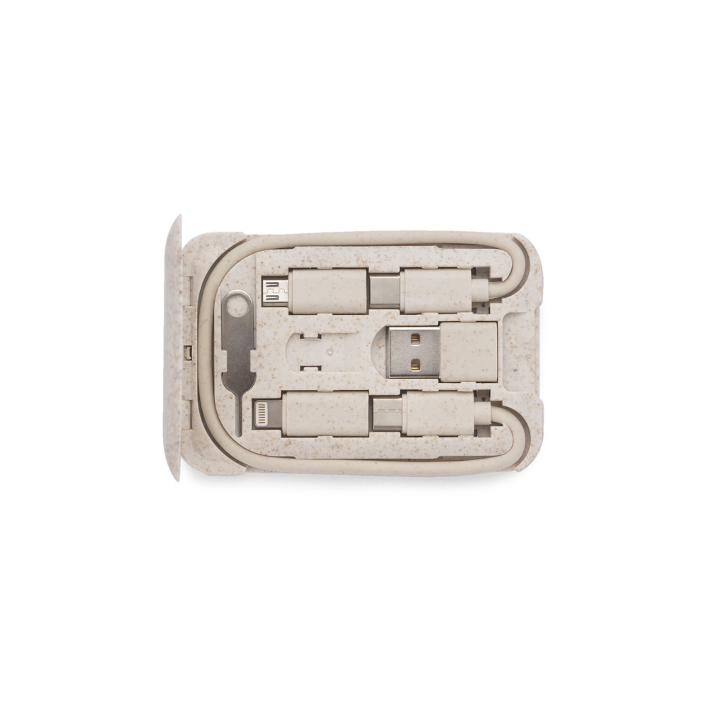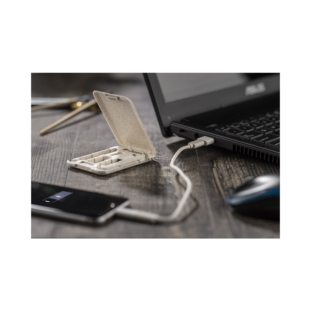 Artikel-Nr: ARD09137-17OLIN ist ein praktisches Set von Ladekabeln, das in jede Handtasche, jeden Rucksack oder jede Tasche passt. Das Basiskabel USB C - USB C zusammen mit Adaptern: USB C - USB, USB C - microUSB, USB C - iPhone ist in einer praktischen und kompakten Etui verpackt, die auch als Ständer für das Telefon dient. Das Gehäuse verfügt außerdem über einen SIM-Kartenschlüssel und ein SIM-Kartenetui. Das Etui besteht aus Kunststoff, der mit 40 % Weizenstroh gemischt ist, so dass bei seiner Herstellung weniger neues Plastik verwendet wird.