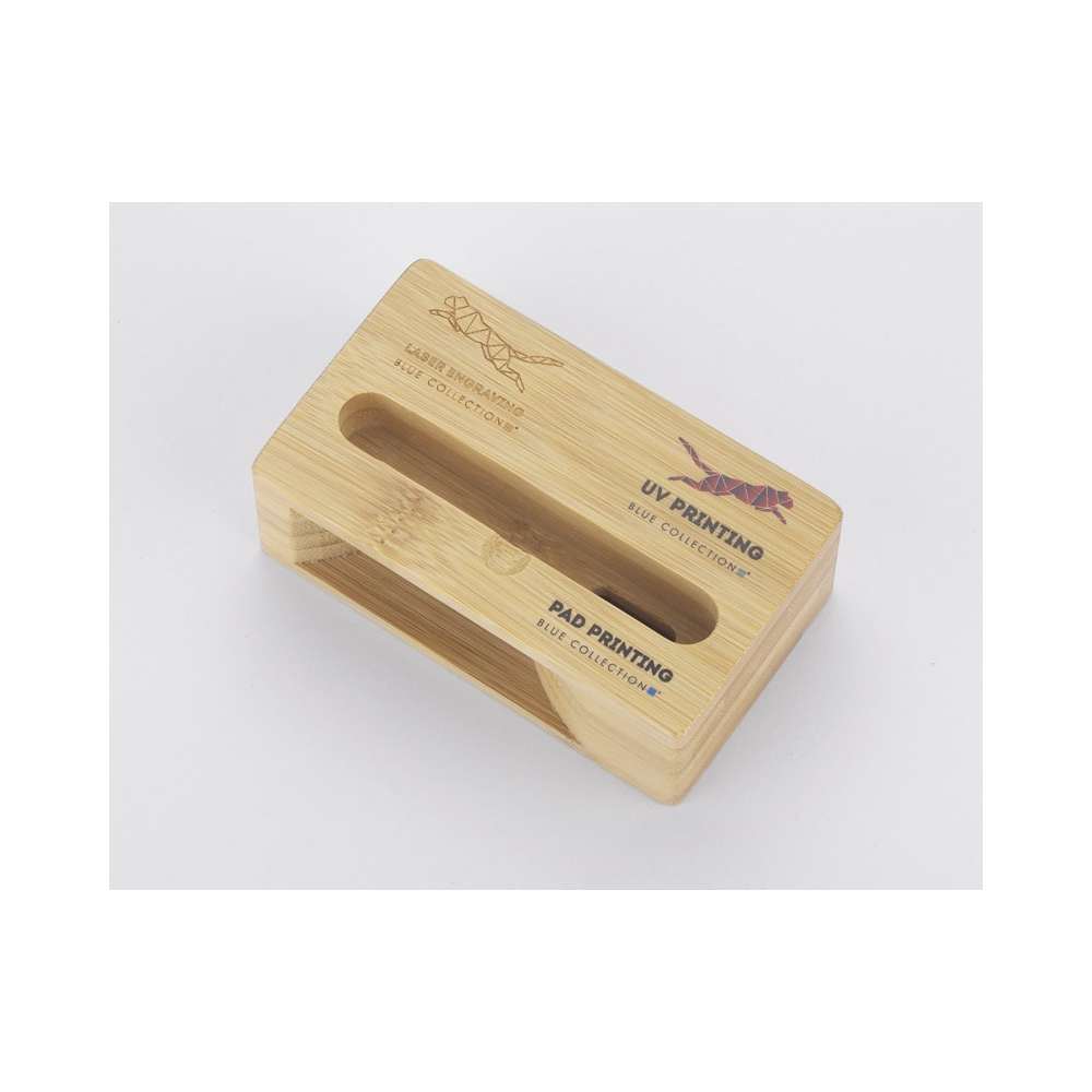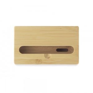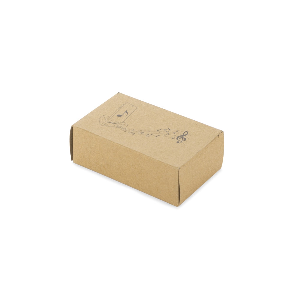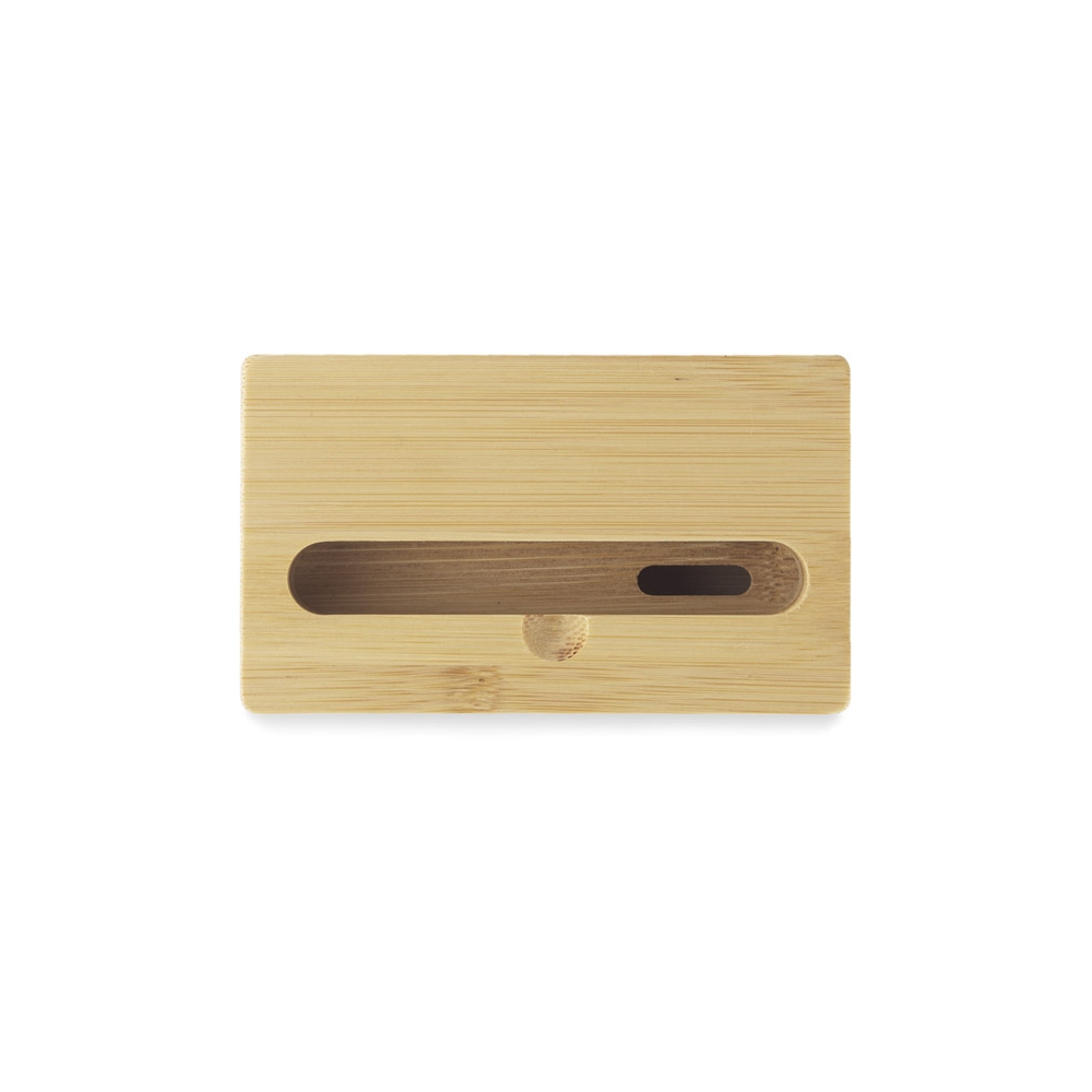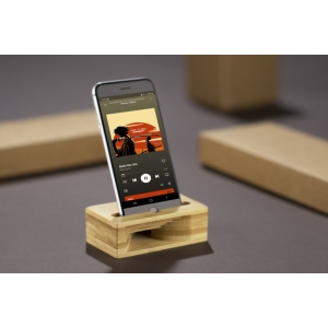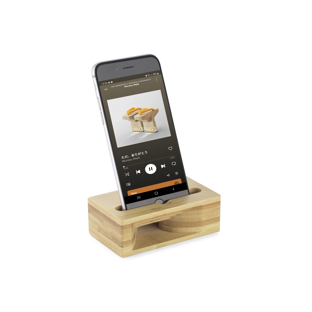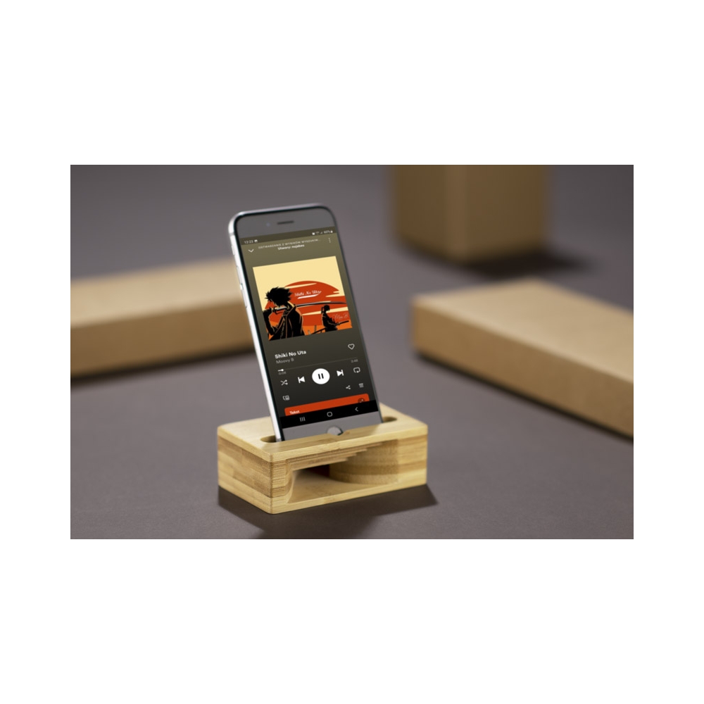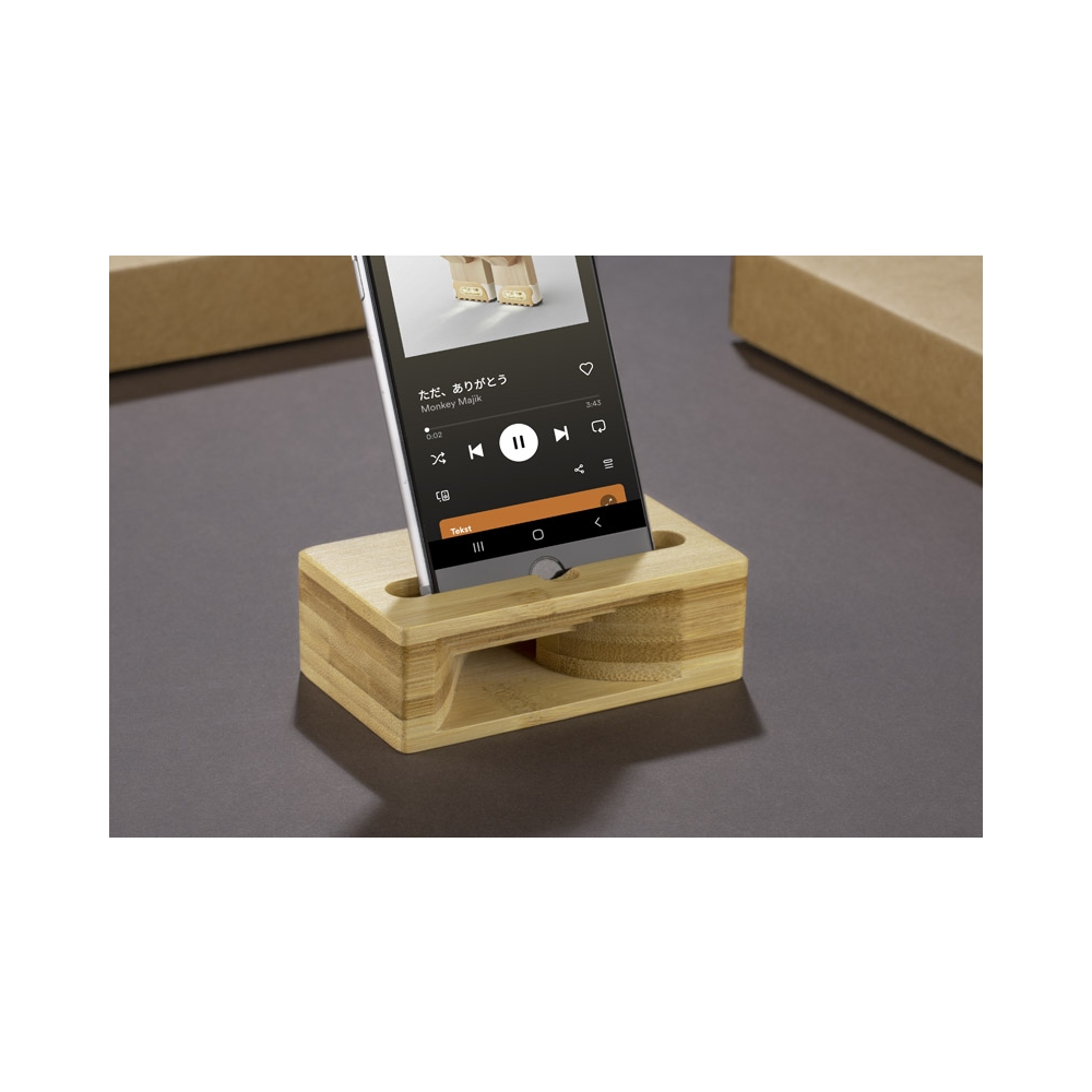 Artikel-Nr: ARD17720-17RESONA ist ein Telefonständer aus Bambus, der auch als Lautsprecher dient. Seine konturierte Form sorgt dafür, dass der Klang aus dem Telefon tiefer und kräftiger wird. Der Ständer ist in einer braunen Pappschachtel mit Infografiken verpackt, die auf seine Funktion hinweisen.