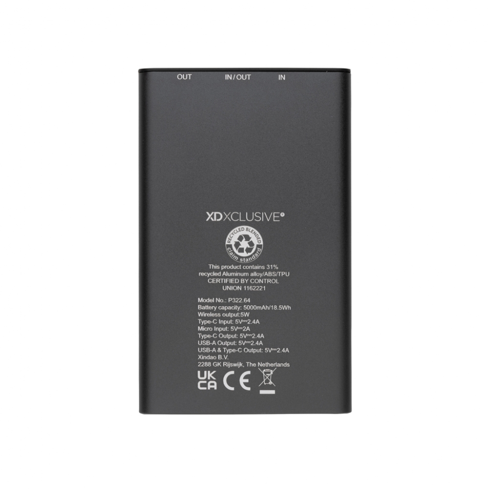 Artikel-Nr: XND322642Powerbank aus RCS (Recycled Claim Standard)-zertifiziert recyceltem Aluminium und ABS. Gesamter Recyclinganteil: 31% bezogen auf das Gesamtgewicht des Artikels. Die RCS-Zertifizierung gewährleistet eine vollständig zertifizierte Lieferkette der recycelten Materialien. Aluminium verliert seine Eigenschaften im Recyclingprozess nicht und kann daher endlos recycelt werden. Die Powerbank enthält einen langlebigen A-Grade Lithium-Polymer-Akku dmit 5000mAh. Das kabellose Ladegerät unterstützt kabelloses Laden mit bis zu 5W. Die Ladestandsanzeigen zeigen die verbleibende Energie an, sodass Sie immer wissen, wann Sie wieder aufladen müssen. Artikel und Zubehör 100% PVC-frei. Inklusive Type-C-Ladekabel aus RCS-zertifiziert recyceltem Aluminium, TPE und PET. Verpackt in FSC®-Mix-Verpackung. USB-Input 5/2,4A, Type-C-Output: 5V/2,4A. Type-C Input: 2,4A. Micro-USB-Input: 5V/2A.