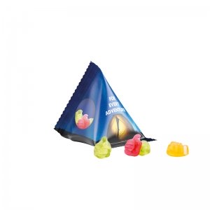 Artikel-Nr: PUC1027.00030Trolli Fruchtgummi im Tetraeder aus transparenter Folie, individuell bedruckt. Inhalt: Trolli Fruchtgummi Daumen, in Premium Qualität mit 10 % Fruchtsaftanteil, bunt gemischt, 15 g