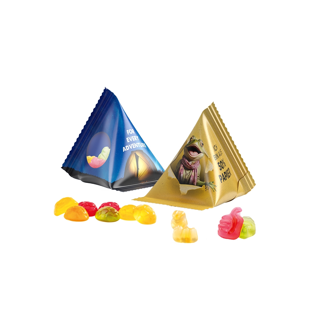 Artikel-Nr: PUC1027.s_15Tetraeder gefüllt mit 15g Trolli Fruchtgummi mit 10% Fruchtsaft, bunt gemischt in den Geschmacksrichtungen Erdbeer, Orange, Zitrone, Ananas, zahlreiche Standardformen wählbar. Die weiße oder transparente Folie ist 4-farbig nach Euroskala bedruckbar. Trolli Fruchtgummi in Premiumqualität mit 10 % Fruchtsaftanteil, bunt gemischt